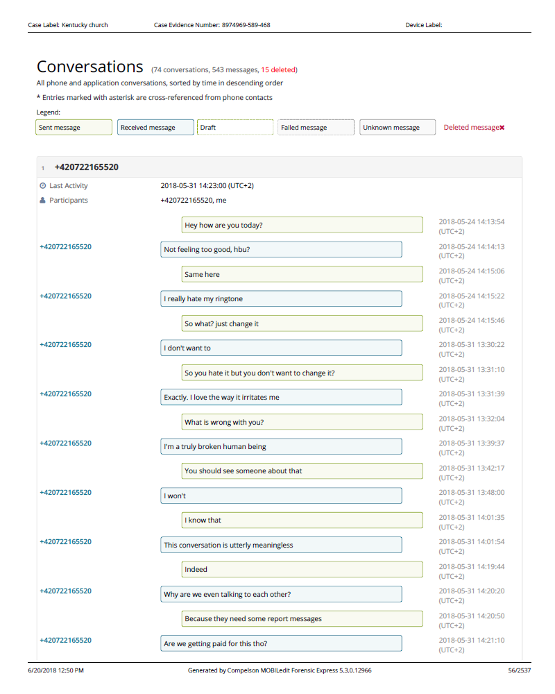 "Phone messages" groups the SMS, MMS, iMessages, application messages and any standard phone messages together. Forensic Express can find any variation of these types of message, and present the gathered data in the report generated.