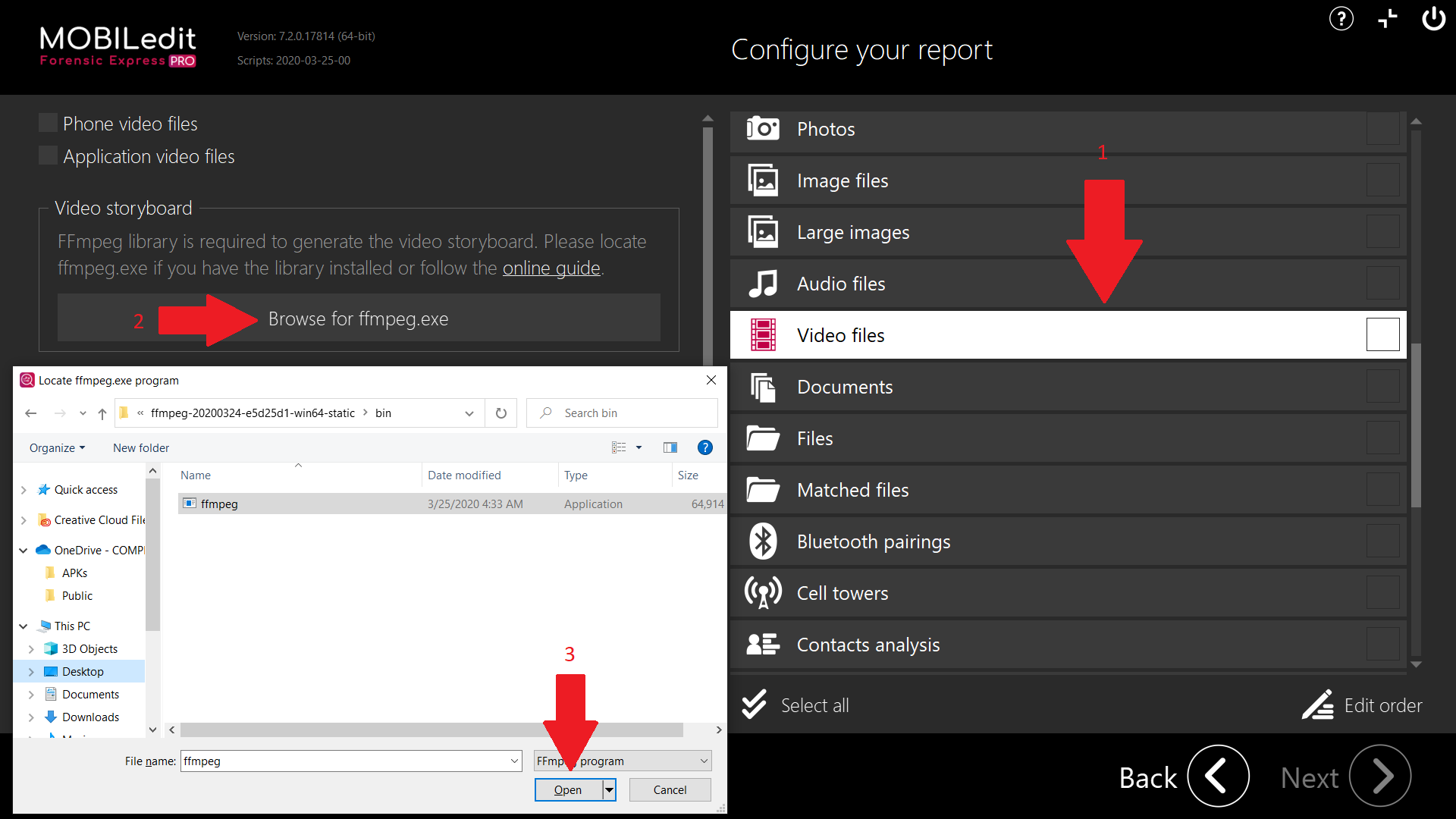 - On the next page select the Video option (1.) then Browse for ffmpeg.exe (2.) and finally navigate to the folder from point 5, select ffmpeg.exe and click Open (3.)