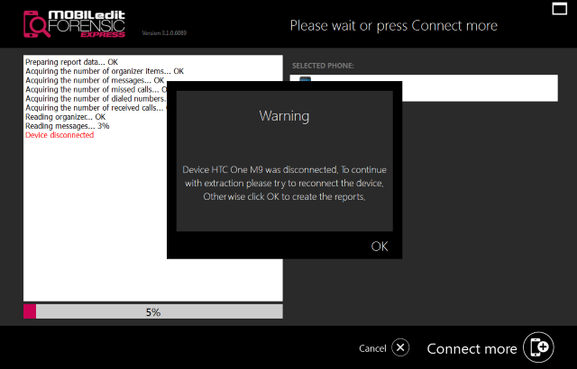 reconnect the phone to continue with the extraction or skip the