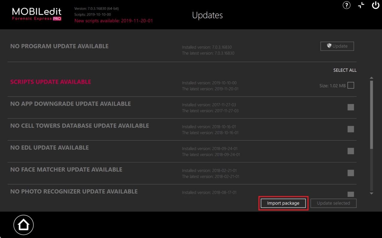 Versions 5.0 and higher also offer the option of an offline update. You can update MOBILedit Forensic Express on a computer not connected to the network by downloading the update packages from our website elsewhere, and then transferring and importing them to the offline device.
